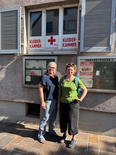 Monja Sales Prado und Angela Neuburger-Schäfer vor der DRK Kleiderkammer in der Urbanstraße.Die zweite Einrichtung, die wir besuchen durften, war die Kleiderkammer des DRK in der Urbanstraße. Auch hier stand früher sicher der karitative Gedanke im Vordergrund. Menschen, die Kleidung brauchen, können sich gut und günstig einkleiden. Auch in Notsituationen wie zum Beispiel nach einem Wohnungsbrand kann schnell mit der nötigsten Kleidung geholfen werden. In der Zwischenzeit spielt aber auch hier der Nachhaltigkeitsgedanke eine Rolle. Die Kleiderkammer ist nichts anderes als ein Second-Hand-Laden, in dem zum Beispiel auch Spielzeug angeboten wird. Haben Sie gebrauchte, aber noch gute Kleidung zuhause, die Sie nicht mehr möchten? Dann bringen Sie diese doch in der Kleiderkammer vorbei! Hier kann Ihre Kleidung eine neue Besitzerin oder einen neuen Besitzer finden und Sie unterstützen den nachhaltigen Gedanken dieser Einrichtung!